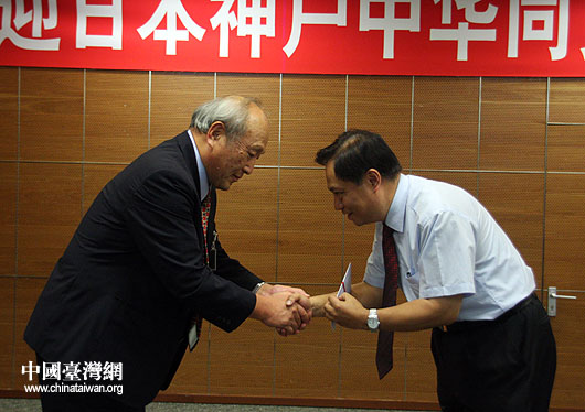 8月25日晚,日本神戶中華同文學校修學旅行團通過全國臺聯向臺灣南部災區捐款約5萬元人民幣。圖為全國人大常委、全國臺聯會長梁國揚(右)從修學旅行團帶隊老師手中接過捐款,并表示感謝。(中國臺灣網 鐘寶華 攝)