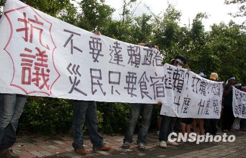 8月31日上午,來自屏東霧臺鄉等地的部分“88水災”受災民眾,打著橫幅在達賴喇嘛下榻的高雄市蓮潭會館外抗議。中新社發 董會峰 攝