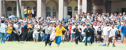 臺灣救援直升機昨天陸續(xù)載出高雄縣小林、六龜災(zāi)區(qū)村民,在旗山中學(xué)守候的家屬等不及直升機降落就往前沖,警察連忙緊追攔人。圖片來源:臺灣《聯(lián)合報》