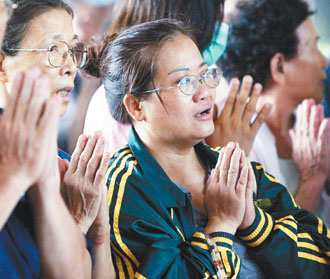 等不到親友安全歸來的焦急民眾,昨天在高雄縣旗山中學(xué)與慈濟義工合十禱告。圖片來源:臺灣《聯(lián)合報》