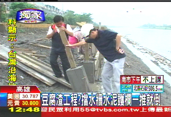 中國(guó)臺(tái)灣網(wǎng)10月22日消息 據(jù)臺(tái)灣TVBS電視臺(tái)報(bào)道,臺(tái)風(fēng)“鲇魚(yú)”使得在919水災(zāi)中受淹最嚴(yán)重的高雄市民再次神經(jīng)繃緊。今日下午,高雄市楠梓地區(qū)里長(zhǎng)向高雄市政府提出抗議,他表示高雄市后勁溪擋水墻工程是“豆腐渣工程”,用2根手指就可以推到,若臺(tái)風(fēng)“鲇魚(yú)”來(lái)襲,后果不堪設(shè)想。