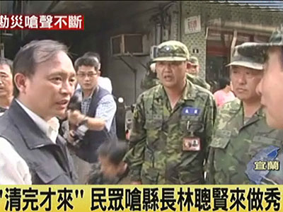 據報道,24日,天氣短暫放晴,民進黨籍宜蘭縣長林聰賢開始巡視淹水災區,卻出現不尋常的現象,幾乎走到哪就被罵到哪。一名大叔說,都淹了好幾天了,還是靠著臺北的女兒上網把淹水的情況公布了大家才知道,而縣長這個時候才到。也有老婦人說,淹水的時候看不到縣政府的人員前來,還不是靠著自己的力量清理家園,都快清得差不多了,縣長才出現。