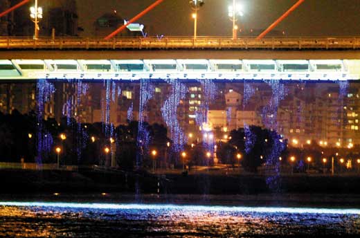 臺北花博25日晚開放夜間游覽,大佳園區大直橋下亞洲最大的戶外數字水幕,首度亮相,一波波秀出各式花博文字、圖形,非常吸睛。圖片來源:臺灣《聯合報》