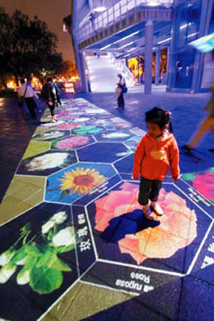 花博四展區,連接美術、圓山兩區陸橋下廣場的互動光雕包括“花語寄情”、“蓮池魚蹤”等和民眾互動的花卉,讓民眾流連往返。圖片來源:臺灣《聯合報》