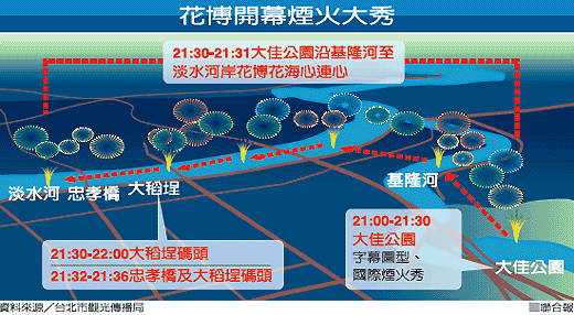接著基隆河、淡水河到大稻埕碼頭間的六公里,將啟動串連煙火,煙火圖案有花博LOGO、梅花及代表世界五大洲心連心的愛心煙火。還有從淡水河中緩緩升起的“臺灣站起來”,燃燒的煙火將在地圖中呈現百花圖案。