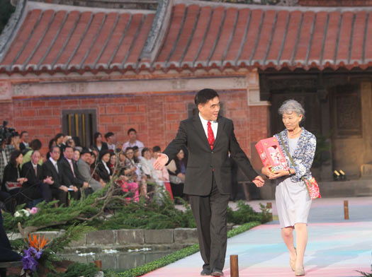 臺北市長郝龍斌(左) 4日出席在林安泰古厝舉行的花博開幕記者會暨“花?裳”展演,邀請“世博奶奶”山田外美代(右)以觀光大使身分,號召欣賞花博之美。