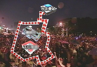 臺灣民眾高舉游行路線模型,三個圖標從下往上依次是陳水扁玉山寓所、臺當局“總統府”和臺北火車站(以上圖片來源:臺灣東森新聞報) |