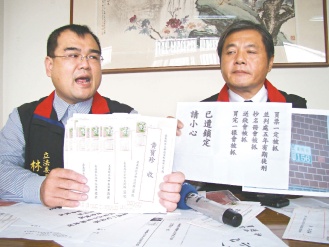 國民黨政策會執行長林益世(左)拿出收到的“賄選已遭鎖定”信件,指控這是選舉奧步。 來源:臺灣《聯合報》