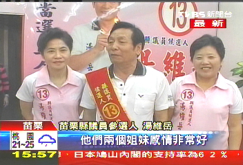 據臺灣TVBS電視臺報道,苗栗縣議員參選人湯維岳,左右手各牽著一個人,高呼勝利口號拜票,不過這兩個人,除了是助選員,還有個特殊身份,她們同時都是湯維岳的老婆。