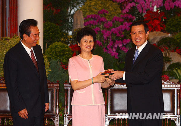 11月6日,馬英九在臺北賓館會見海協會會長陳云林一行。這是馬英九向陳云林夫人賴曉華贈送禮品。新華社記者 邢廣利 攝