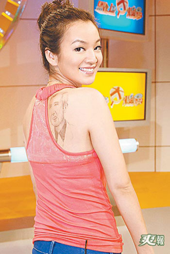 不過,右肩有圖、左肩卻顯得空空的,這時(shí),另一個(gè)主持人Ruby突發(fā)奇想說:“右邊有‘馬總統(tǒng)’,左邊再畫個(gè)馬夫人,來個(gè)軟骨功,把左右臉邊的肩胛骨合起來,就可以讓‘馬總統(tǒng)’與馬夫人玩親親了。”
