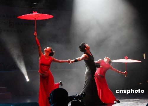 上海殘疾人藝術團的聾人舞蹈演員在晚會上表演舞蹈《紅黑傘》。中新社發 周兆軍 攝
