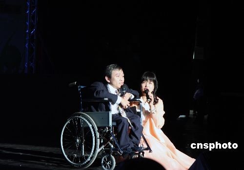 雙腿殘疾的劉銘(左)和雙目失明的朱萬花主持晚會。中新社發 周兆軍 攝