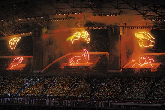 據(jù)了解,開幕式當(dāng)晚,當(dāng)場(chǎng)內(nèi)手語主持人用手語打出“媽媽我愛你”、“朋友我愛你”、“世界我愛你”時(shí),網(wǎng)幕焰火將在夜空中打出“生命”、“陽光”、“關(guān)愛”三組巨型手語圖案。作為首個(gè)手語煙花表演,這個(gè)獨(dú)特的創(chuàng)意來自哪里?黃剛告訴記者:“‘生命陽光,與愛同在’的理念來自胡錦濤總書記提出的‘讓關(guān)愛的陽光照亮每一位殘疾人的心靈’指示精神。說起手語,大家都會(huì)想起殘疾人,但是一般人對(duì)手語并不太了解,我希望這個(gè)煙花能夠激發(fā)人們對(duì)手語的好奇心,去了解手語,并關(guān)注殘疾人,進(jìn)而學(xué)會(huì)關(guān)愛殘疾人。”