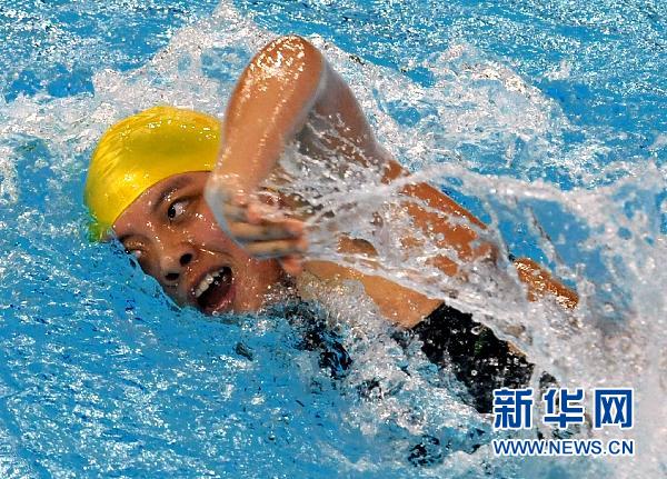 12月13日,中國選手蔡余慶燕在比賽中。當(dāng)日,在廣州2010亞殘運會游泳比賽女子S9級400米自由泳決賽中,中國選手蔡余慶燕奪得冠軍,為中國代表團獲得首枚金牌。新華社記者王頌攝