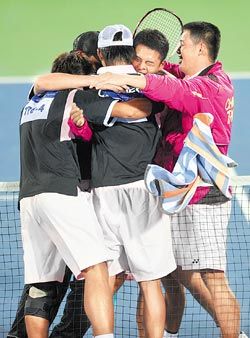 中華臺北亞運軟網男子代表隊14日在廣州亞運男子軟網團體賽金牌戰中拿下本屆亞運中華臺北代表團的第一面金牌,所有隊員與教練興奮得緊緊擁抱在一起。圖片來源:臺灣中國時報