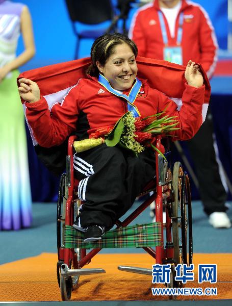 12月13日,敘利亞選手努拉·巴杜爾身披國旗在領獎臺上露出燦爛笑容。當日,敘利亞選手努拉·巴杜爾在廣州2010年亞殘運會女子A組40公斤級舉重比賽中,以82.5公斤的成績奪得銀牌。新華社記者范長國攝