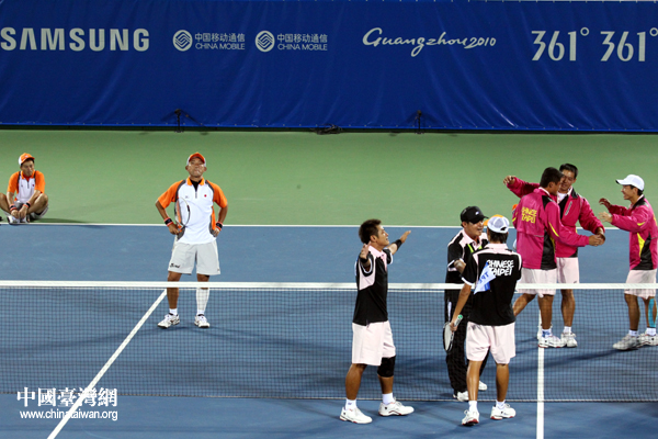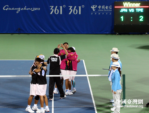 中國臺灣網11月15日廣州消息 第十六屆廣州亞運會軟式網球男子團體賽決賽,14日下午在廣州天河體育中心球場舉行,中華臺北隊在軟式網球男子團體賽中上演“驚天大逆轉”,以2:1戰勝衛冕冠軍日本隊,摘獲代表團在本屆亞運會上的首枚金牌。(記者 李徽)