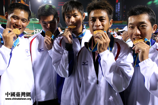 五位中華臺北隊選手親吻金牌。(中國臺灣網 鐘寶華 攝)