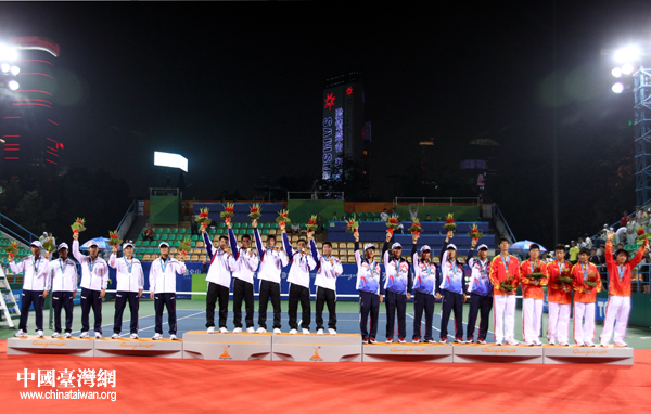 中華臺北隊軟式網球男團奪金,站上最高領獎臺。(中國臺灣網 鐘寶華 攝)