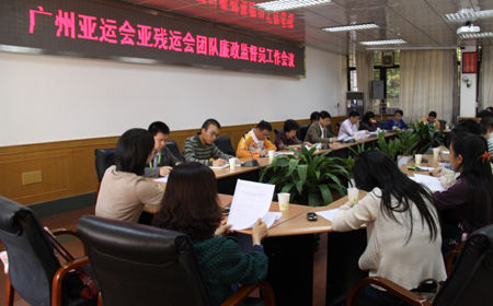 廣州亞運會亞殘運會22個團隊的廉政監(jiān)督員、運動員村監(jiān)督部和亞組委監(jiān)察審計部領導及工作人員共35人出席了會議。