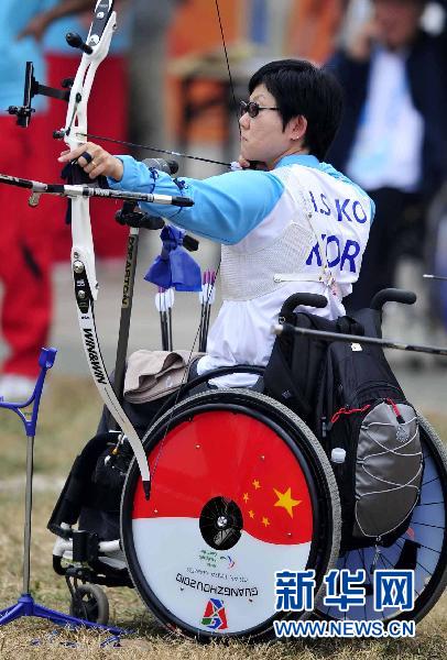 12月13日,韓國選手高希淑在比賽中。當日,在廣州2010年亞殘運會女子團體反曲弓公開級排名賽中,韓國隊以1811環的總成績打破世界紀錄。新華社記者陳曄華攝