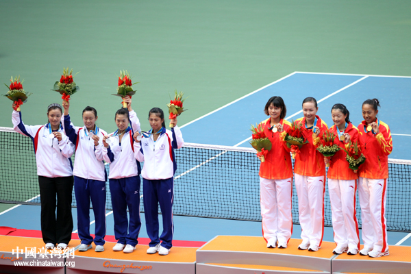中國臺灣網(wǎng)11月16日廣州消息 第十六屆廣州亞運會女子網(wǎng)球團體賽決賽,雖然中華臺北隊不敵中國隊,獲得銀牌,但在頒獎儀式上,兩岸女網(wǎng)金花們卻十分輕松,交流不斷。(記者 鐘寶華)