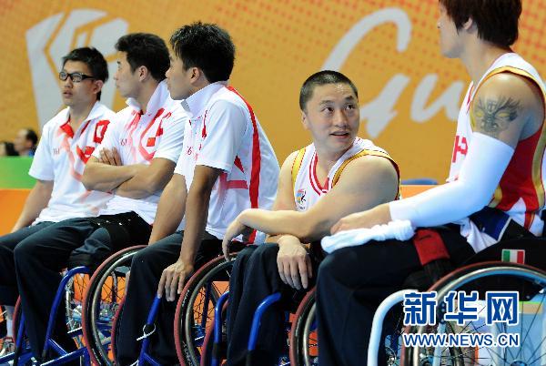 12月14日,在2010年亞殘運(yùn)會(huì)中國對陣阿聯(lián)酋的輪椅籃球賽場邊,陳海江(右二)與年輕球員交流。 34歲的陳海江是中國男子輪椅籃球隊(duì)最年長的球員。13年前的一場可怕事故讓這位內(nèi)蒙古小伙腰部以下完全癱瘓,陳海江的人生陷入灰暗。是籃球重新燃起陳海江的希望,6年的輪椅籃球生涯讓陳海江的人生重新“站”了起來!新華社記者劉大偉攝