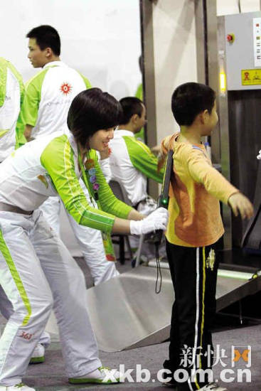 每日早上8時30分,觀眾開始進場,志愿者詹婷婷也開始了一天的安檢工作。跟她一起當亞運安檢志愿者的,還有同校的23名女同學、104名男同學。記者看到,這些志愿者需要對每一位觀眾進行前、后身從頭到腳的掃描,這意味著每檢查一個觀眾就要下蹲兩次。