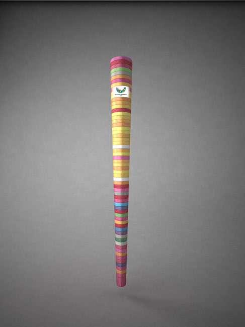 火炬的設計靈感來自于深圳大運會會徽“歡樂的U”,以圓點切片為基本元素建構火炬基本形態。每個橢圓形切片以大運會色彩系統為基礎,以紅、黃為主色,體現陽光、青春、圣火的色彩意向。火炬的創意亮點在于橢圓形、多彩切片可以任意旋轉出各種造型,是一支可與火炬手互動、造型百變的火炬。每一位火炬手都可以根據自己的想象,調節出自己喜愛的火炬形狀。這就意味著:每一位火炬手和他的火炬都是獨一無二的。 (大運會官網供圖)