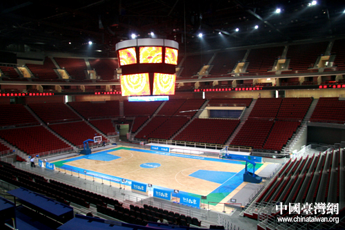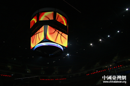走進場館,一臺狀如漏斗的中央吊斗屏系統從“天”而降,據場館工作人員介紹,這臺自重達22噸的漏斗屏幕是國內首套全彩高清LED顯示系統,可實現同步直播、慢鏡回放、賽況播報、積分統計、廣告滾動等多項功能,還可以配合場內文藝表演播放背景畫面。