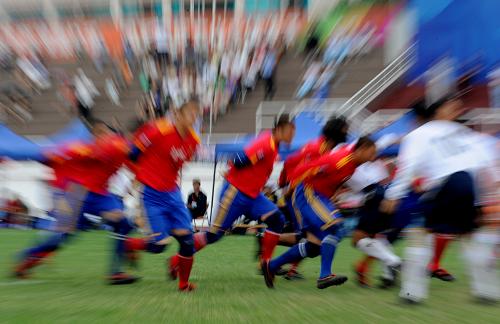 9月14日,貴州隊隊員(紅)在比賽中掩護進攻。當日,在第九屆全國少數民族傳統體育運動會花炮比賽中,北京隊以6比1戰勝貴州隊。新華社 記者 焦衛平 攝