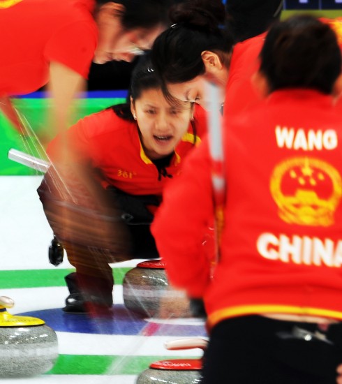 2月26日,中國隊隊員在比賽中。當日,中國女子冰壺隊以4比9的比分不敵瑞典隊,無緣決賽。