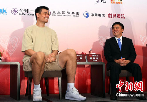 “2010姚基金慈善之旅”7月27日在臺北舉行記者會,姚明與臺北市長郝龍斌等出席。據悉,由臺灣和上海組成的心連心隊與美國職業籃球明星隊,將于28日在臺北小巨蛋舉行表演賽,姚明希望球迷通過欣賞精彩的比賽,加入公益活動行列。中新社發 宋吉河 攝