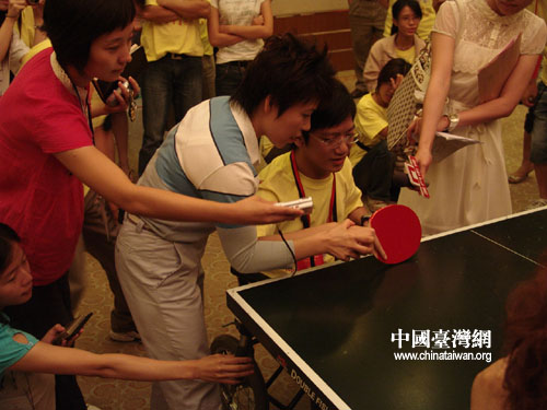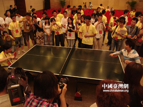 中國臺灣網8月23日北京消息 參加“兩岸青年攜手迎奧運”交流活動的代表們22日上午與三位奧運會冠軍在北京齊聚一堂。兩岸青年與睿智善言的鄧亞萍、詼諧幽默的楊凌、美麗動人的楊揚交流并得以與之切磋球技。