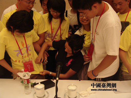 楊揚也忙得不亦樂乎。她的身旁圍了許多爭著照相、索要簽名的青年代表們。“沒想到奧運冠軍會那么漂亮!”,“她不像練體育的啊,更像是拍電影的,怎么看那么像趙雅芝啊!”,這樣的驚嘆不絕于耳。楊揚一一滿足了大家的要求,并在短短的時間內與臺灣青年代表們交上了朋友。