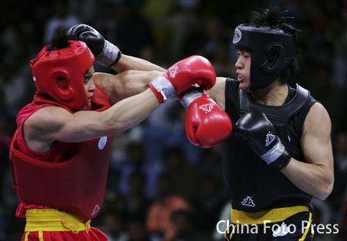 12月14日,多哈亞運(yùn)男子武術(shù)散手-65公斤級的比賽中,中國選手趙光勇摘金牌。圖為本次比賽精彩圖。