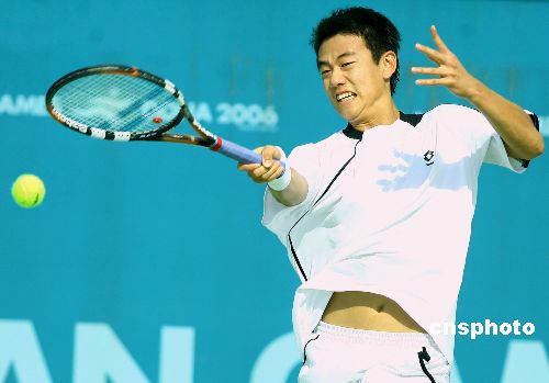 十二月五日,第十五屆多哈亞運會男子網球團體四分之一決賽,中國臺北隊以二比零戰勝菲律賓隊,挺進四強。圖為中國臺北運動員王宇佐在比賽中。