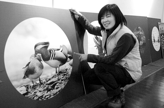 1月5日,臺(tái)灣攝影師張燕伶在展示她拍攝的鴛鴦?wù)掌?lái)源:淅江新聞網(wǎng)