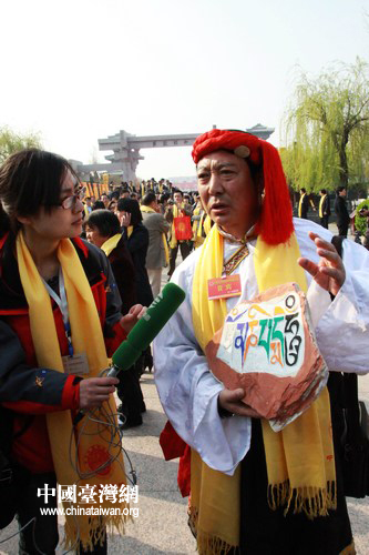 一位少數民族參會者在展示他帶來的祈福藝術品。(中國臺灣網 馬迪 攝)