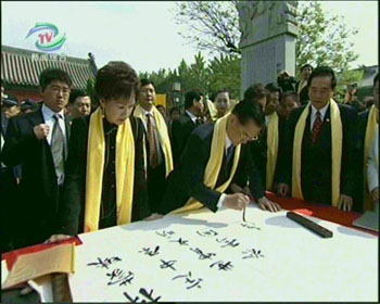 連戰一行于4月16日下午抵達鄭州,18日晚出席了丁亥年黃帝故里拜祖大典歡迎晚宴并欣賞拜祖大典音樂會。今天,連戰夫婦在中共中央臺辦主任陳云林的陪同下入場,并為大典題字。大典開始后,佩戴黃帝絲巾的連戰夫婦齊步趨前,恭敬地向黃帝像敬獻花籃,并凈手點火上香,鞠躬參拜。