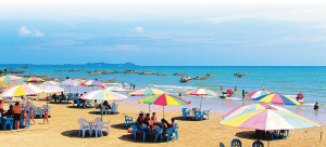 東興以美麗的山海風(fēng)光、優(yōu)美的海濱浴場、濃郁的京族風(fēng)情和方便快捷的跨國旅游,形成了以跨國旅游為龍頭,“上山下海又出國”的旅游知名品牌。圖為游人如織的東興金灘。