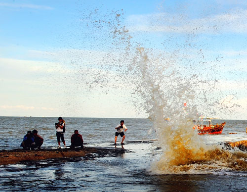 7月2-6日,廣西欽州市三娘灣舉辦一年一度的觀潮節。連日來,天文大潮氣勢恢宏,巨浪撲擊巖石,濺起十余米高,場面十分壯觀.吸引了許多游客和攝影愛者前往觀光。據景區門票收入統計,僅7月5日周六這一天,進入景區觀潮的人數逾4萬人次.