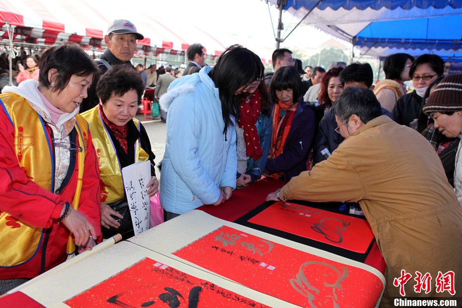 2月12日下午,冒著冷風(fēng)細雨,臺灣數(shù)千名書法家及愛好者在臺北揮毫,迎接辛卯新春。現(xiàn)場翰墨飄香,展現(xiàn)書藝傳承,充滿文化氣息。中新社記者 董會峰 攝