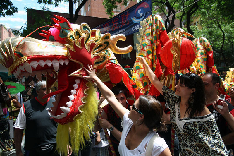 當地時間1月30日,在阿根廷首都布宜諾斯艾利斯“中國城”舉辦的廟會上,當地民眾觸摸龍頭。阿根廷華僑華人當天在布宜諾斯艾利斯的“中國城”舉行春節廟會,慶祝中國農歷新春佳節的到來。這是當地華人連續第五年舉辦春節廟會活動。