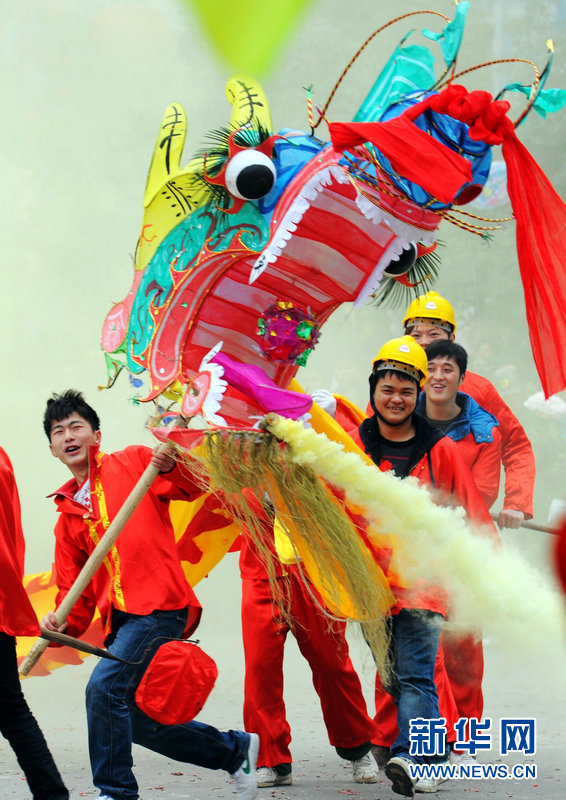 2月16日,德江縣街頭,一支舞龍隊伍在表演。當(dāng)日,貴州省德江縣的10萬土家族群眾走上街頭舞龍燈、演儺戲、扭秧歌,喜迎元宵節(jié)。 新華社記者 劉續(xù) 攝
