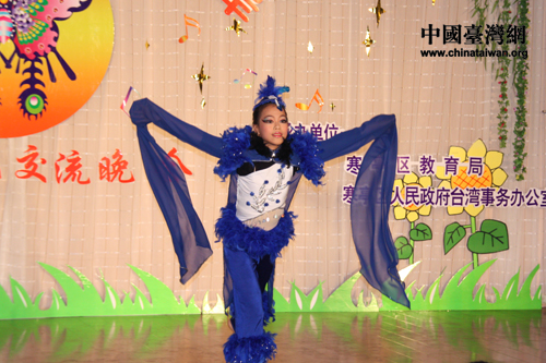 臺灣的鄭菜庭同學表演了現代舞《想飛的羽翼》,只見她身著藍色艷麗舞衣,揮動著幾倍于她身高的舞袖,時而行云流水,時而旋轉翻騰,兩岸青少年們都屏住呼吸,靜靜欣賞她的表演。當她表演結束時,現場爆發熱烈的掌聲,大家都被她高超的舞蹈造詣所折服。寒亭區的同學們相互問詢她叫什么名字,都搶著和她合影。