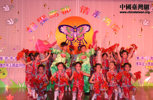 晚會由濰坊市教育局、濰坊市臺辦主辦,能容納300人的寒亭區外國語學校階梯教室座無虛席。寒亭區外國語學校的舞蹈《開門紅》拉開了晚會的序幕,他們身穿紅色小褂,舞蹈熱情有勁,引來臺灣學生陣陣感嘆“太可愛了”。