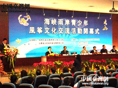 中國臺灣網4月21日濰坊消息 海峽兩岸青少年風箏文化交流活動4月20日在山東濰坊開幕。臺北縣南山中學的20名師生代表及濰坊市第一中學的師生代表共計500余人出席了開幕式。