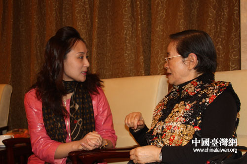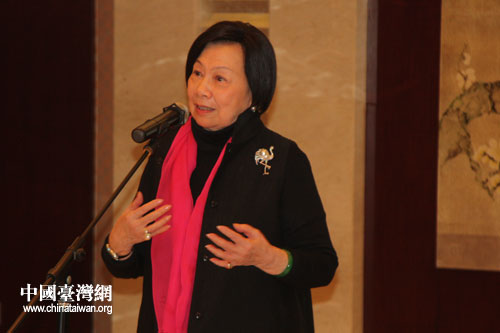 出席海峽兩岸京劇藝術(shù)論壇的臺灣;鶗岸麻L辜振甫遺孀、臺灣中華婦聯(lián)總會主任委員辜嚴(yán)倬云,在兩岸京劇票友聯(lián)誼活動現(xiàn)場演唱《鎖麟囊》選段春秋亭。(中國臺灣網(wǎng) 董潔 攝)